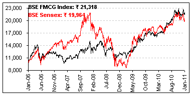 So, if one were to invest Rs 10,000 in the BSE FMCG Index 5 years ago (i.e. on January 20, 2006), the same would have been worth Rs 21,318 on January 21, 2011, whereas a similar investment in the broader index – BSE Sensex would have yielded Rs 19,964.